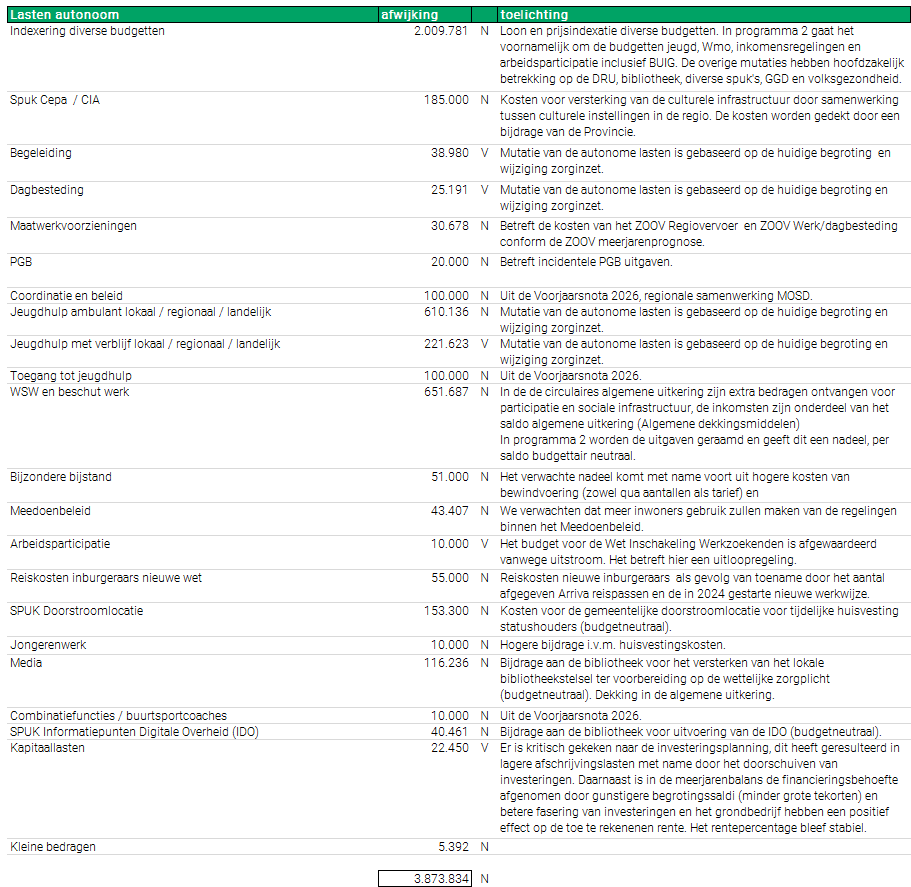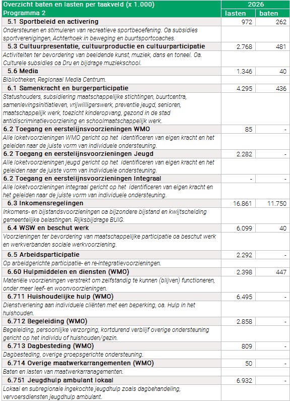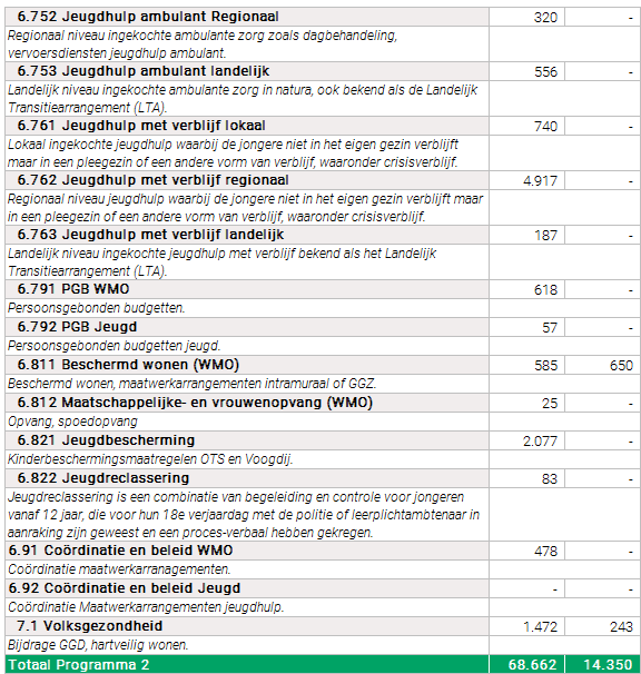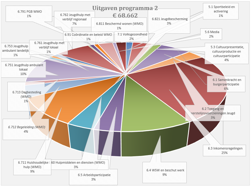 In totaal geven we binnen programma 2 bijna € 69 miljoen uit. In onderstaand overzicht is te zien waar het geld naar toe gaat.